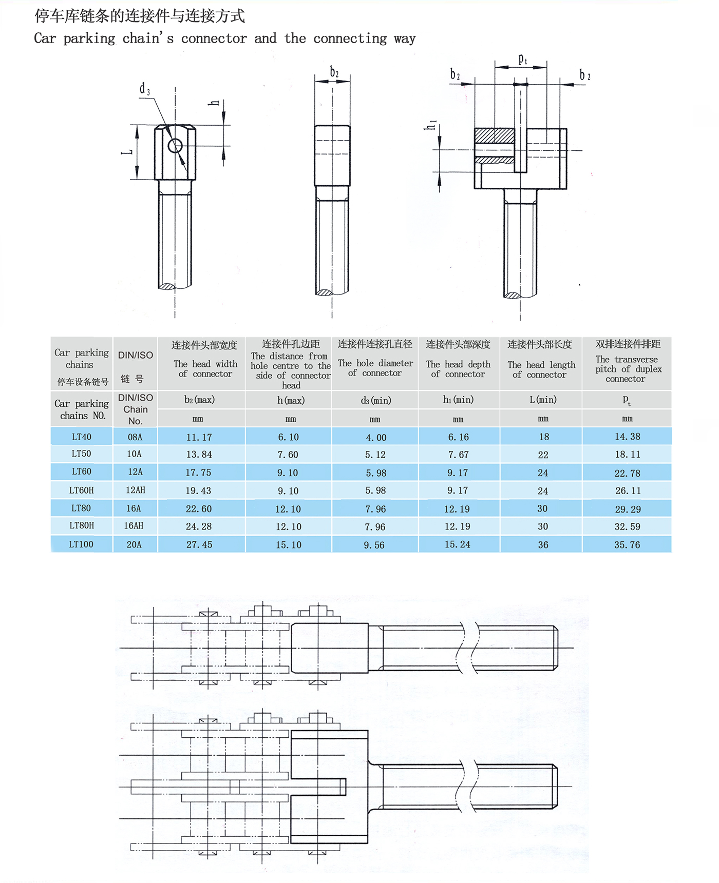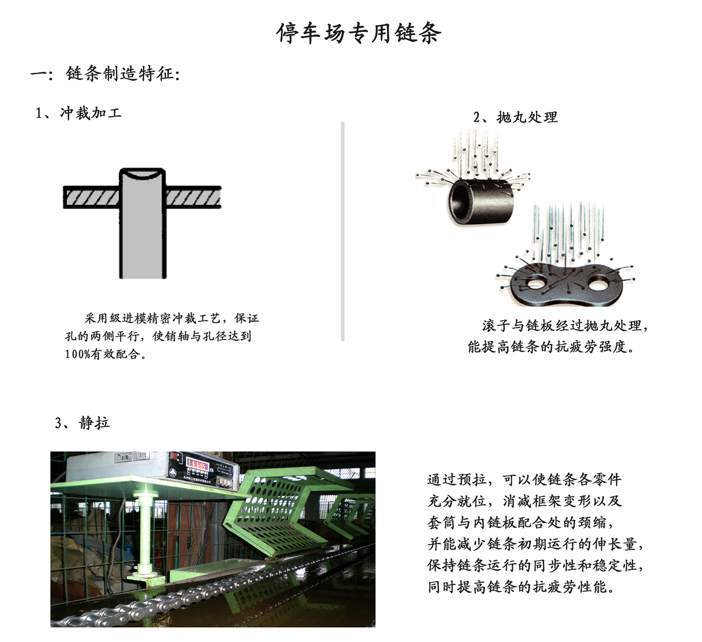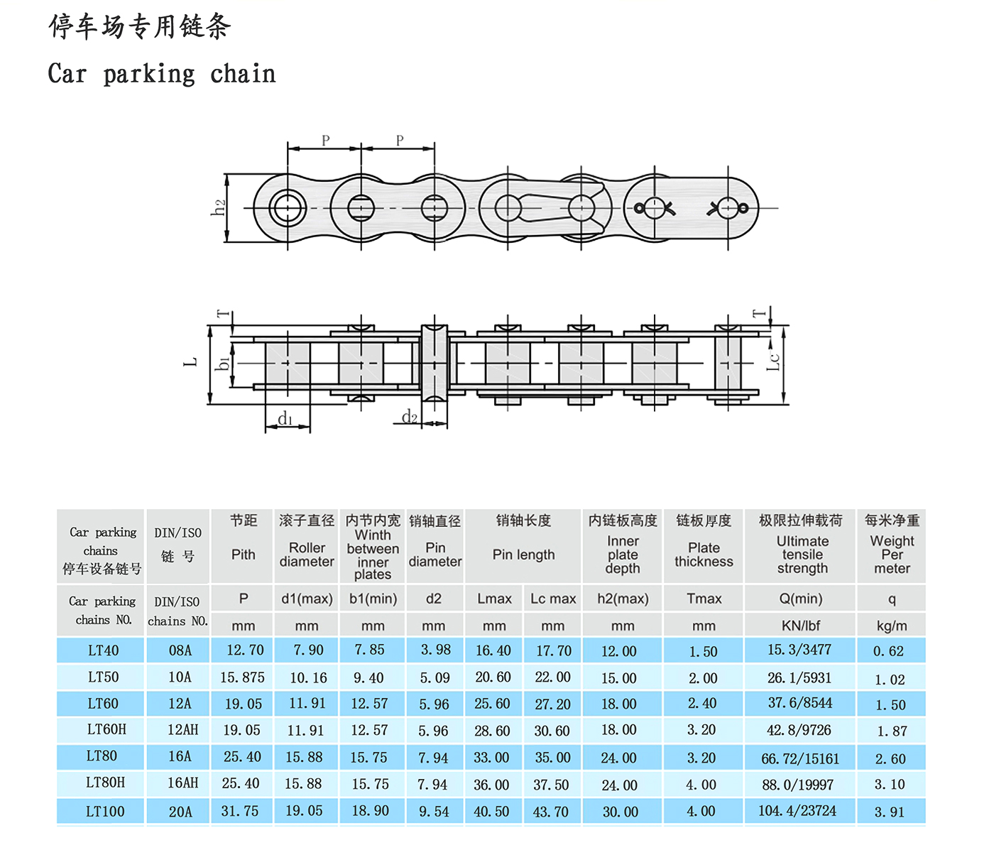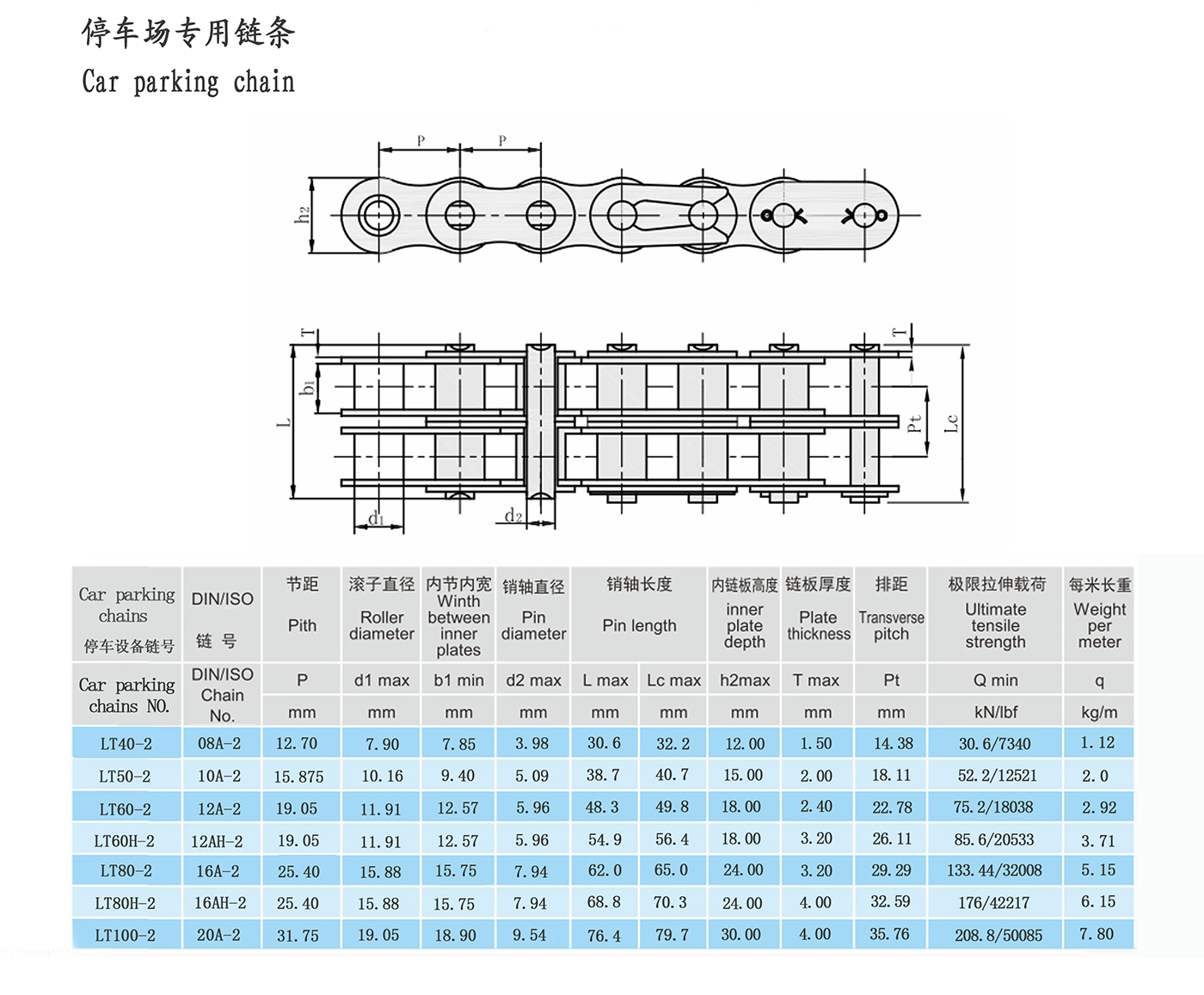 지능형 3차원 주차장 장비의 체인은 주차 장비 본체의 2단계 전송입니다. 구현 표준은 JB/T11079-2011입니다. 체인의 사용 특성: 큰 운반 능력, 높은 인장 강도(정적 강도), 최소 인장 강도는 일반 정밀 롤러 체인보다 10%-30% 더 높으며 뒤틀림 지수, 체인 길이 정확도, 피로 저항 등도 일반 정밀 롤러 체인보다 높습니다.