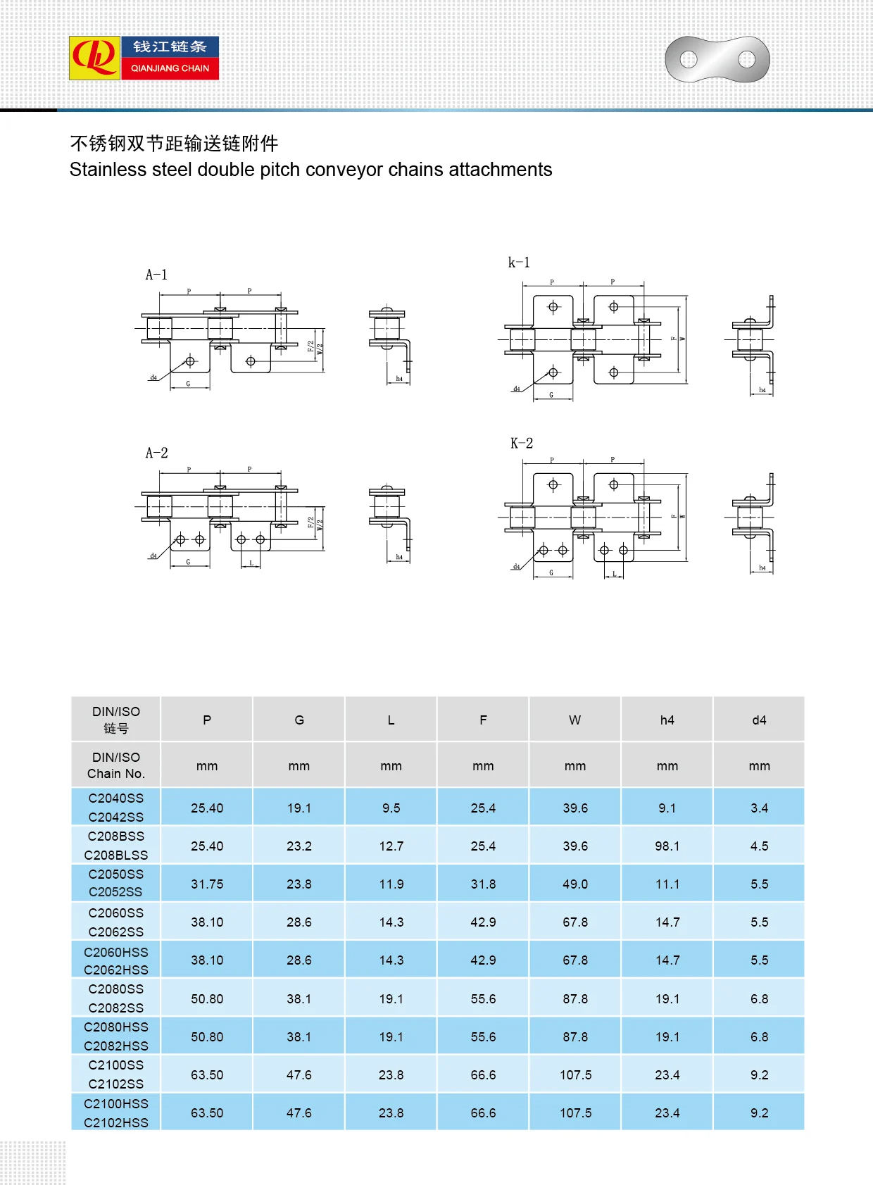 스테인레스 스틸 이중 피치 컨베이어 체인 부착물