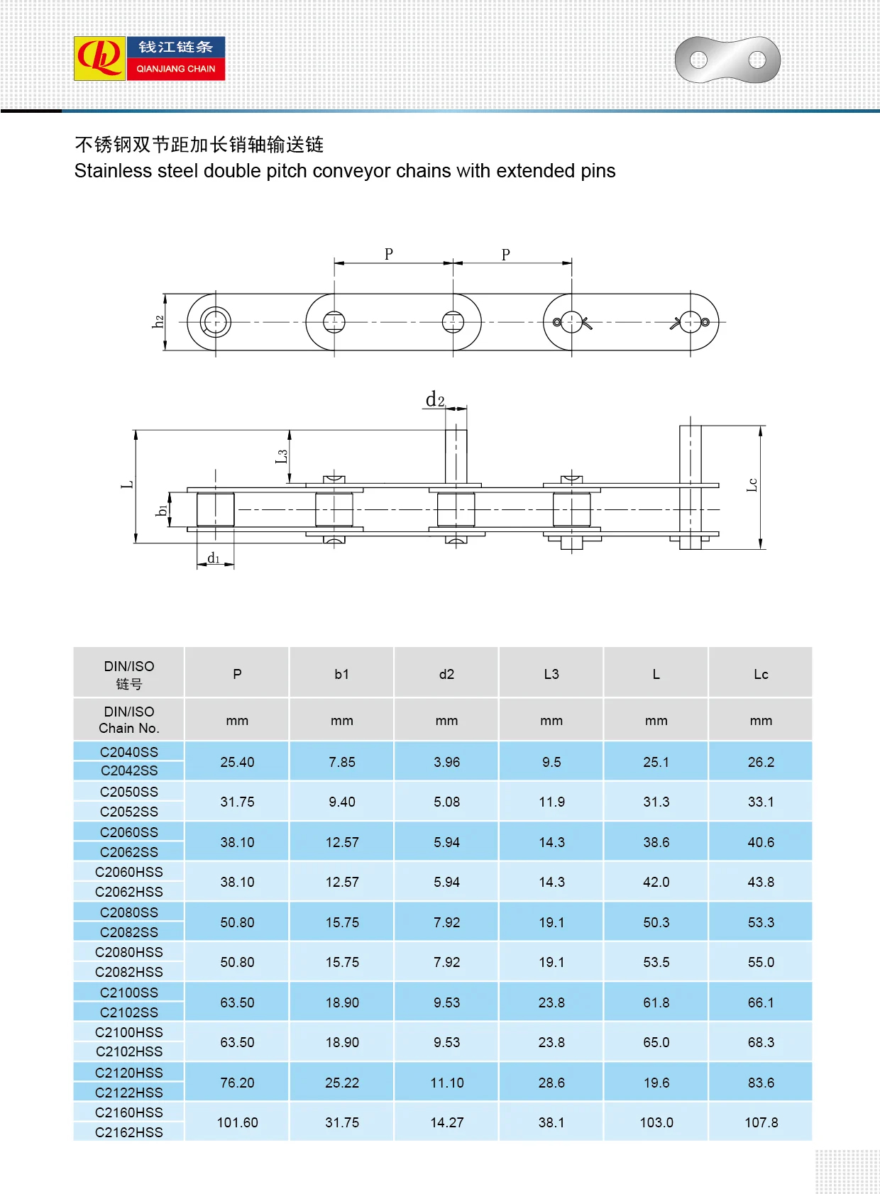 확장된 핀이 있는 스테인리스 스틸 이중 피치 컨베이어 체인